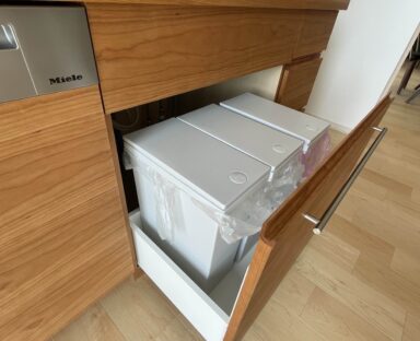オーダーならではの引き出しを紹介します。ここはゴミ箱スペース