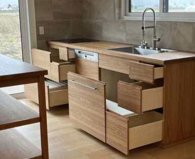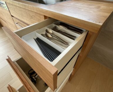 逆に、アイランド作業台は、いろんな人が料理をしたり、手伝ったりしやすいように、フルオープンにして、どこに立っていても、物を取ったり、しまったりできるようにしました。