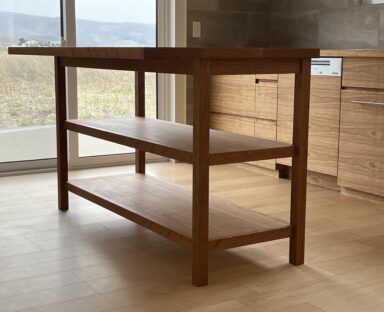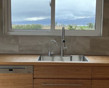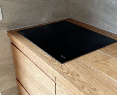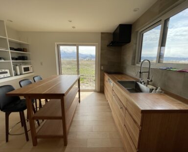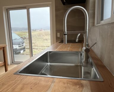 キッチンも作業台も、手鉋仕上げなので、ツルツルで水が染み込むことがない!